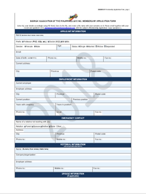 Click on pic to download. Email all requirements (Updated CV, scanned PRC or PAMET ID, accomplished application form [this one] and proof of deposited membership dues) to bioriskassociationphilippines@gmail.com