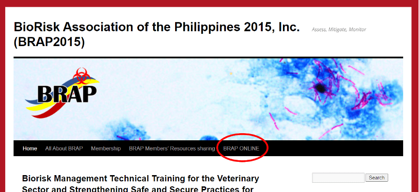 - To create your BRAP Account, using your web browser, go to https://bioriskassociationphilippines.org/ and click on BRAP ONLINE.