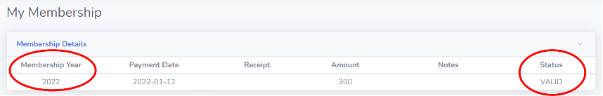 - Once request has been validated, membership year will be visible and the status will be valid.