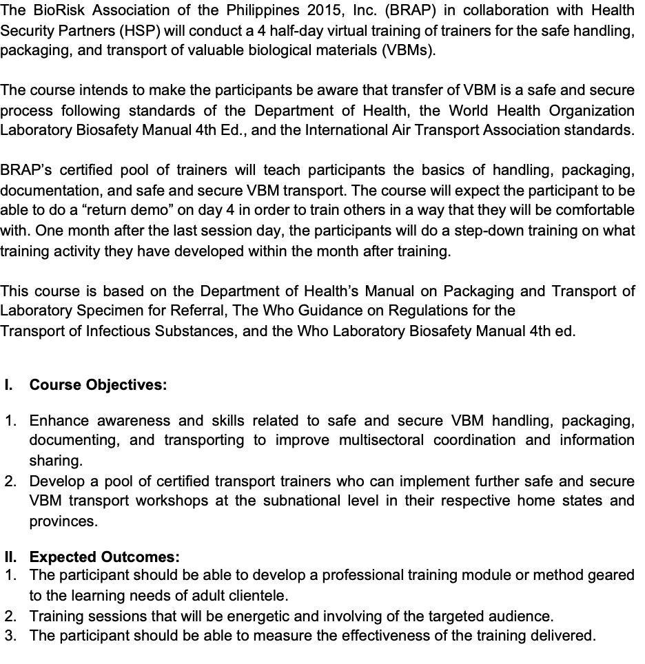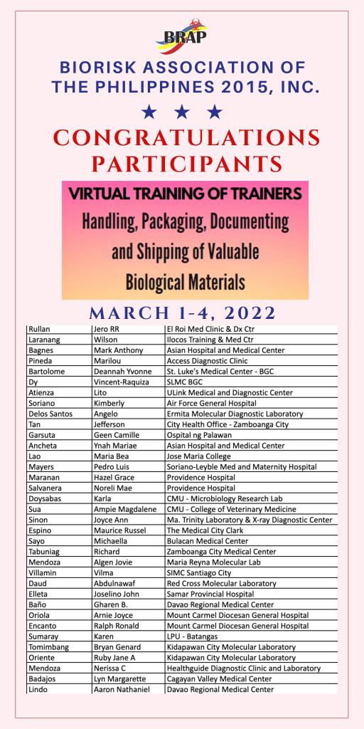 This is the list of participants for the Virtual Training of Trainers: Handling, Packaging, Documenting and Shipping of Valuable Biological Materials on March 1–4, 2022.