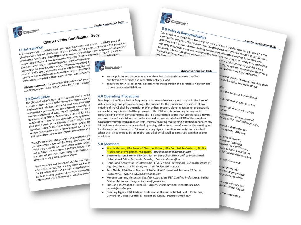 Mission Statement – The mission of the Certification Body is to provide excellence in certification of technical competencies for biorisk management professionals worldwide.