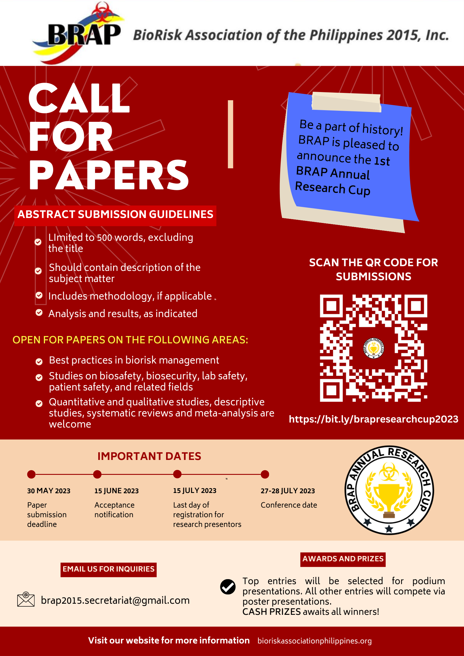 BRAP is pleased to launch its Annual Research Cup; a venue to showcase best biorisk practices and biosafety research studies as part of its advocacy of building biosafety resiliency in the region. The presentation will be held during its 6th Annual Convention and 4th International Forum on July 27 to 28, 2023. Read the guidelines in the poster below and be part of BRAP’s biorisk advocacy history.