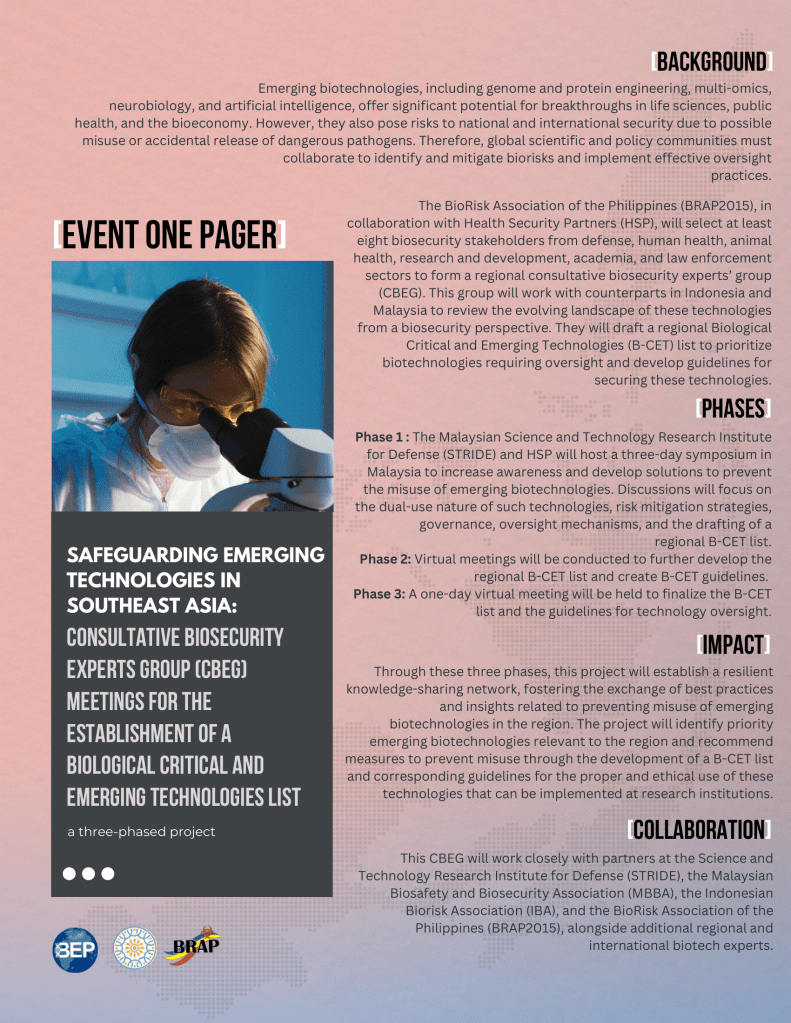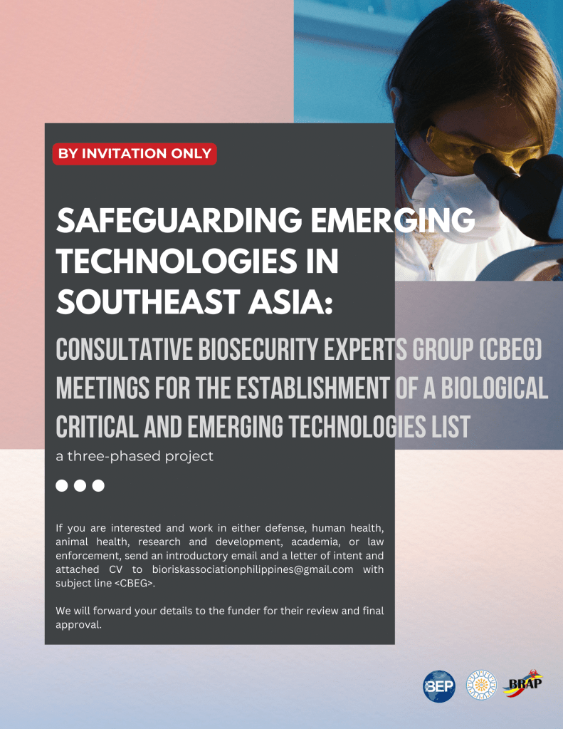 If you are interested and work in either defense, human health, animal health, research and development, academia, or law enforcement, send an introductory email and a letter of intent and attached CV to bioriskassociationphilippines[at]gmail.com with subject line <CBEG>.