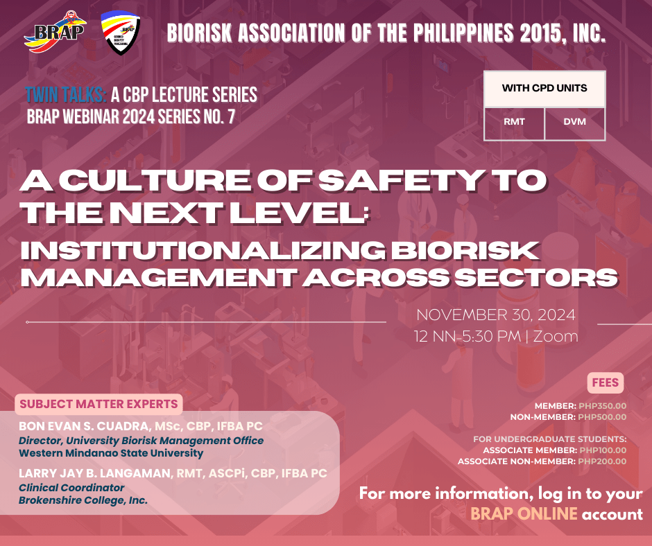 Introducing the BRAP Twin Talks 2024, a captivating series of webinars that showcases the remarkable graduates of the Certified Biosafety Officers Expertise Training Course (CBPetc) by the BioRisk Association of the Philippines 2015, Inc.