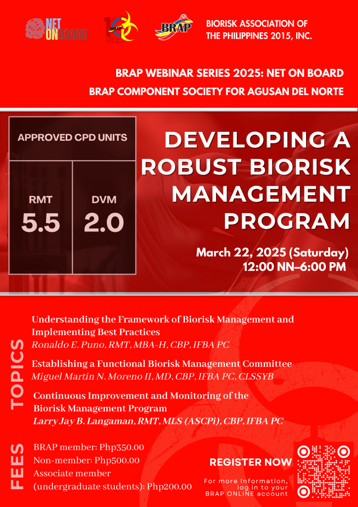 The BioRisk Association of the Philippines 2015, Inc. (BRAP) and BRAP Component Society for Agusan del Norte proudly invite you to the third webinar of the BRAP Webinar Series 2025: Net on Board, titled “Developing a Robust Biorisk Management Program”.