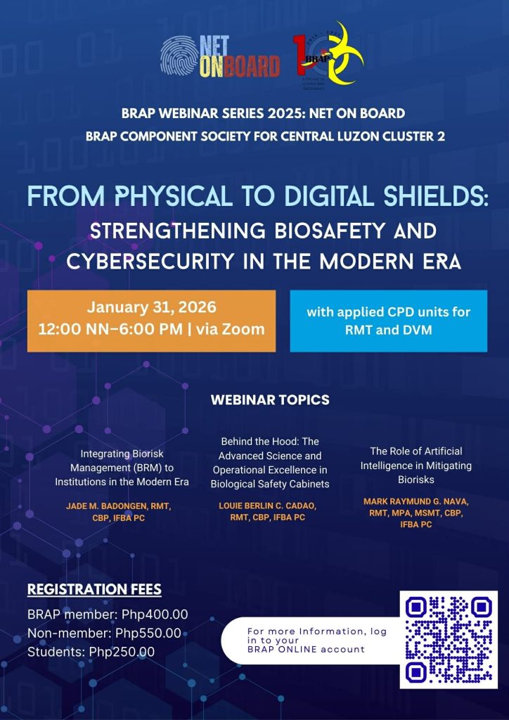 BRAP’s advocacy continues this 2026 as we invite you to join us in the “BRAP Webinar Series 2026: Net on Board BRAP Component Society for Central Luzon Cluster 2: From Physical to Digital Shields: Strengthening Biosafety and Cybersecurity in the Modern Era”, featuring the BRAP Component Society for Central Luzon Cluster 2: PABAOZ.