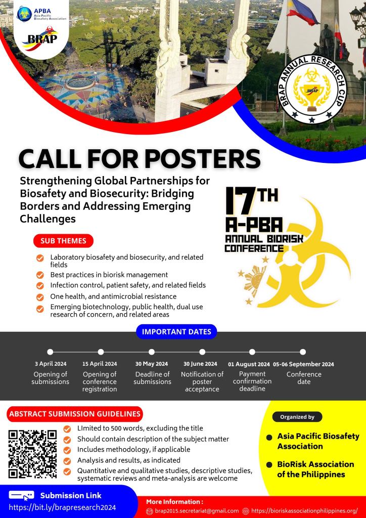 We are now accepting submissions for poster entries to the BRAP 2nd Annual Research Cup alongside the 17th Asia Pacific Biosafety Association Annual Biorisk Conference in conjunction with the BRAP 7th Annual Convention and 5th International Forum on September 5 and 6, 2024.